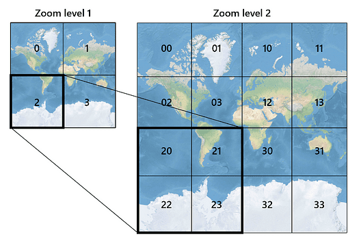 Bing Maps launched in the same year as Google Maps, i.e., 2005, but took a different approach to mapping the globe when it used Quadtrees (conceptually quite similar to geohashes). Bing Maps’ Quadtree goes up to 23 levels. This implementation by Bing Maps is called Quadkey.