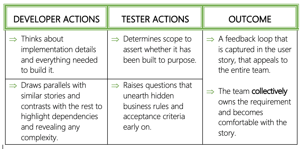 The trio goes through the acceptance criteria and test scenarios together in detail with different perspectives in mind.
