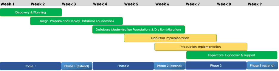 Ensuring a targeted set of outcomes as part of the approach, Versent aims to ensure that all activites are linked to database optimisation and success. This includes the processes to validate, test and prove that the optimisation and migration has achieved the results anticipated. The timing for this objective driven process are: