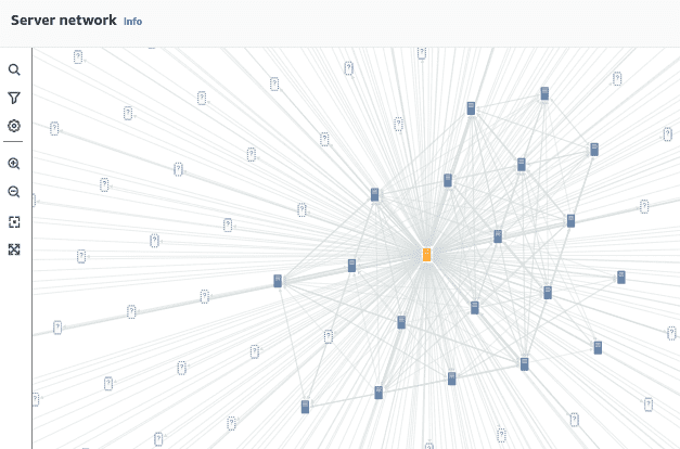 An example network diagram generated by ADS. The orange node is the source server, and bold nodes are hosts known to ADS; the question mark nodes are unknown hosts being communicated to from the source or another known host.