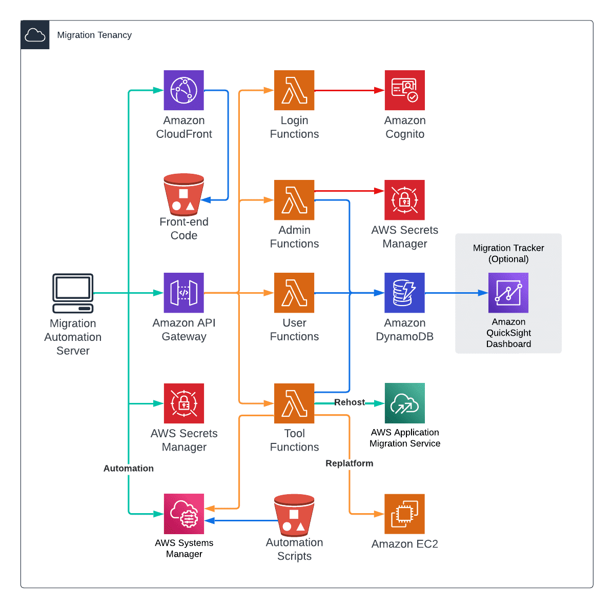 The tracker feature is backed by DynamoDB so that migration teams can easily collect current and target state host information using an authenticated user through cognito and an API gateway fronted form tool.