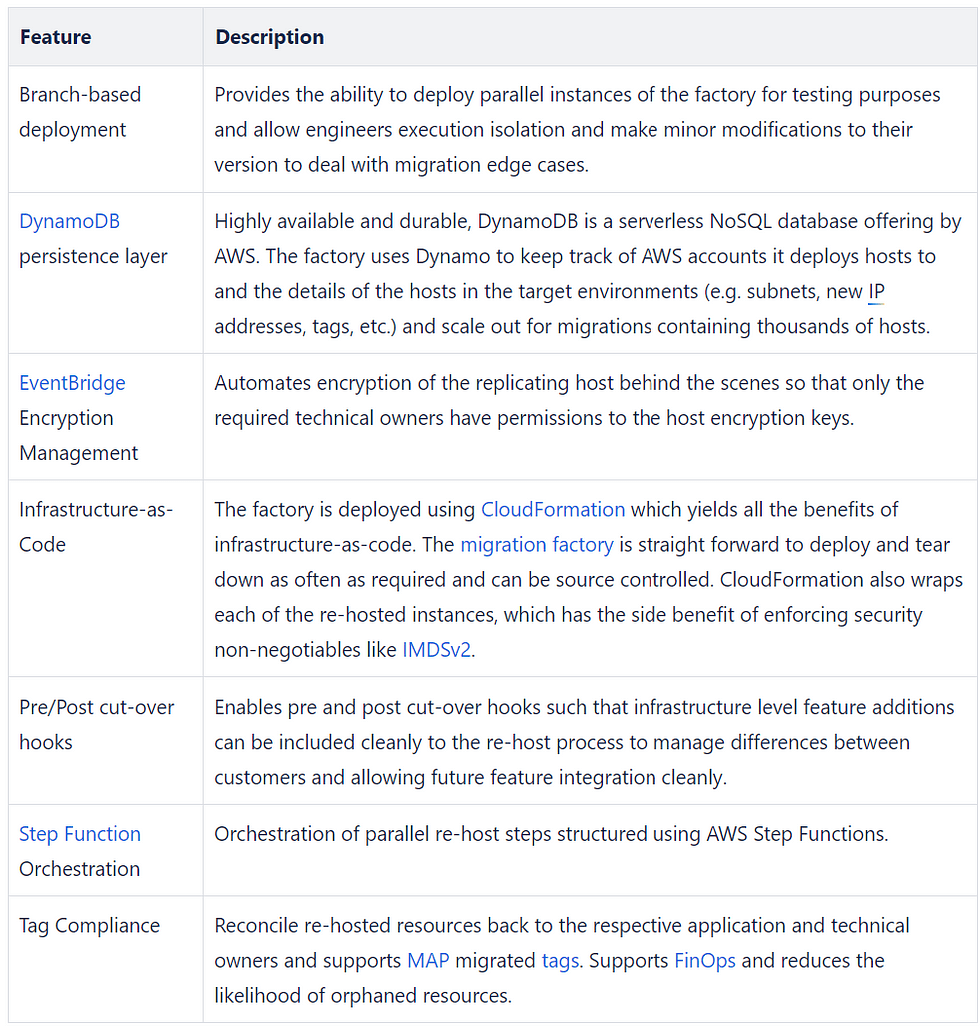 Versent has created this automation and the collection of scripts we call the migration factory. The solution has gone through multiple iterations and has reached a state that it has become a tool we regularly deploy out to customers to augment engineering teams and accelerate cloud migrations. Some of the best-practice features we have added to the factory include:
