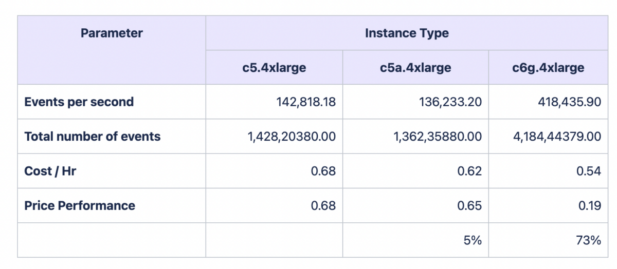 - Graviton shows a significant jump in performance based on the number of events processed and even larger in terms of price performance ratio.