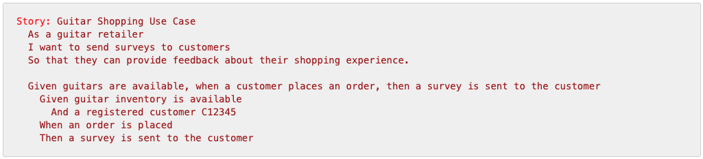 In the example above, the phrase Given guitar inventory is available is derived from the GuitarInventoryIsAvailable() method name. Similarly, the phrase And a registered customer C12345 is derived from the ARegisteredCustomer() method, and the C12345 is the value of the customerNo parameter.