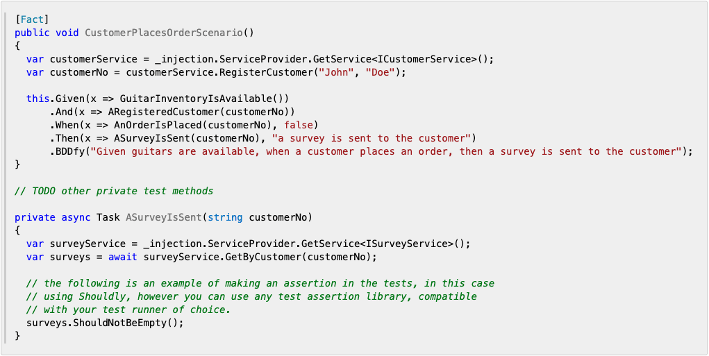 Rather than deriving output from the method names, it is also possible to pass a literal string to be displayed in the report. For example, .Then(x => ASurveyIsSent(customerNo), "a survey is sent to the customer") is rendered as Then a survey is sent to the customer.