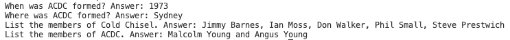 Using the knowledge supplied, it will correctly answer the question “When was AC/DC formed?” with “1973”. However, if you were to remove the lines from the knowledge variable and rerun, the base model is unable to answer the question (accurately).