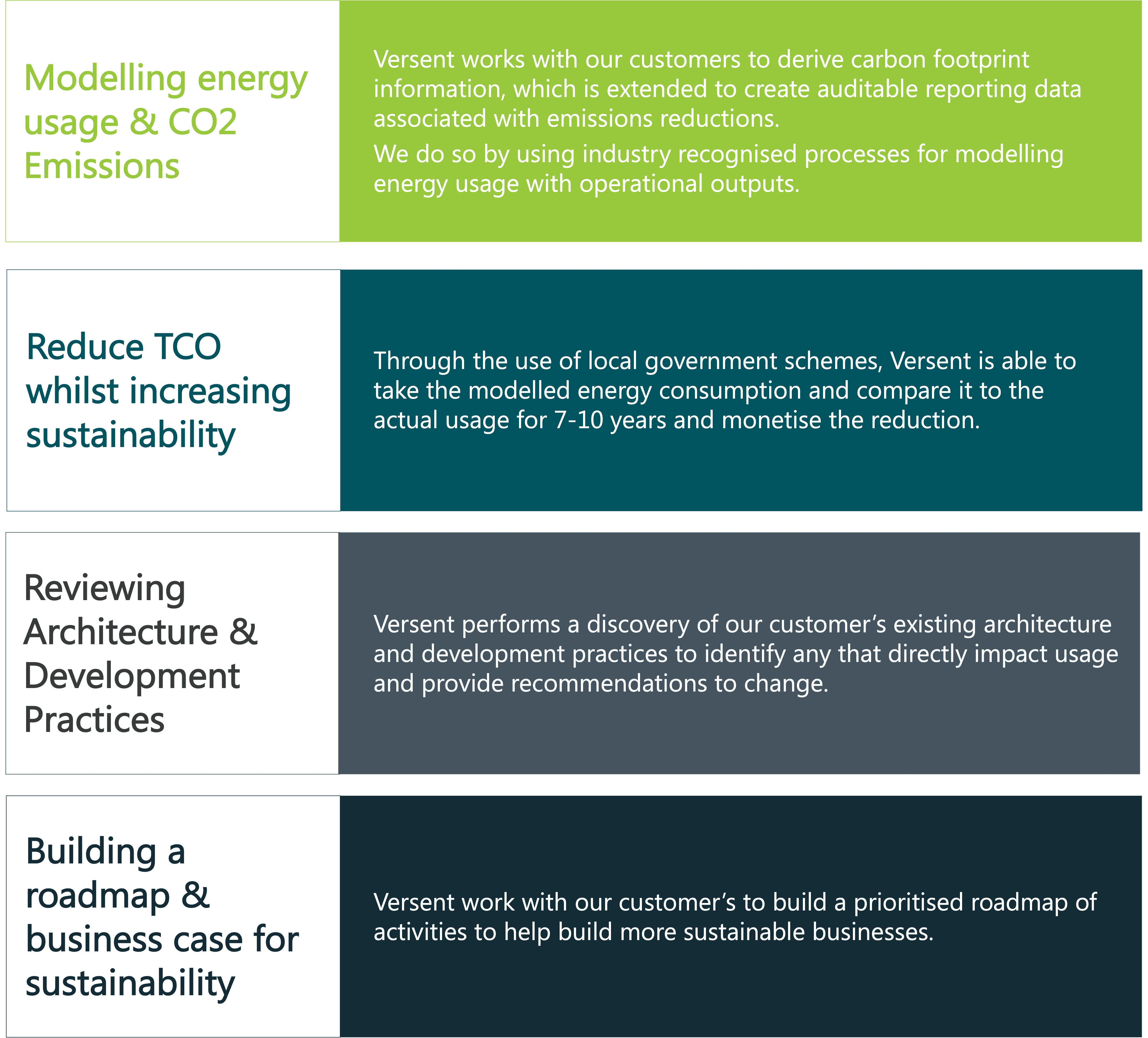 By utilising hyper-scale cloud technologies, our customers are already saving up to 80% of their emissions due to hardware & facilities efficiency and renewables. Versent builds on this by further optimising our customer’s consumption and converting the concept of “Carbon Intensity” and the “Carbon Footprint” to auditable, reportable and monetisable data.